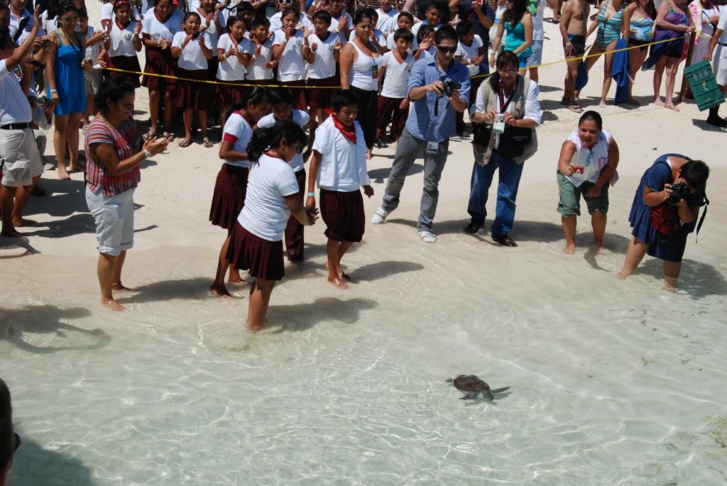 As part of the activities of the induction program developed by the park Xcaret various students from different institutions came together to release sea turtles more than 15 months old, since 1993, to strengthen reproductive of the species Chelonia mydas, better known as White Turtle, which naturally nest on the beaches of Quintana Roo and has been threatened by predation, environmental degradation and urban sprawl.